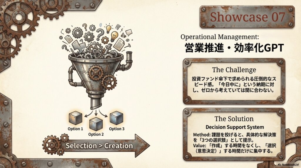 営業管理職の女性は、社内の「お薬の値上げ交渉」という極めてシビアな課題にAIを投入しました。「誰が、いつまでに、何をすべきか」を、膨大な商品データと紐付けて提案させるGPTsです。スピードを求められる投資ファンド等との仕事において、AIを「思考の高速化エンジン」として位置づけているのが印象的でした。