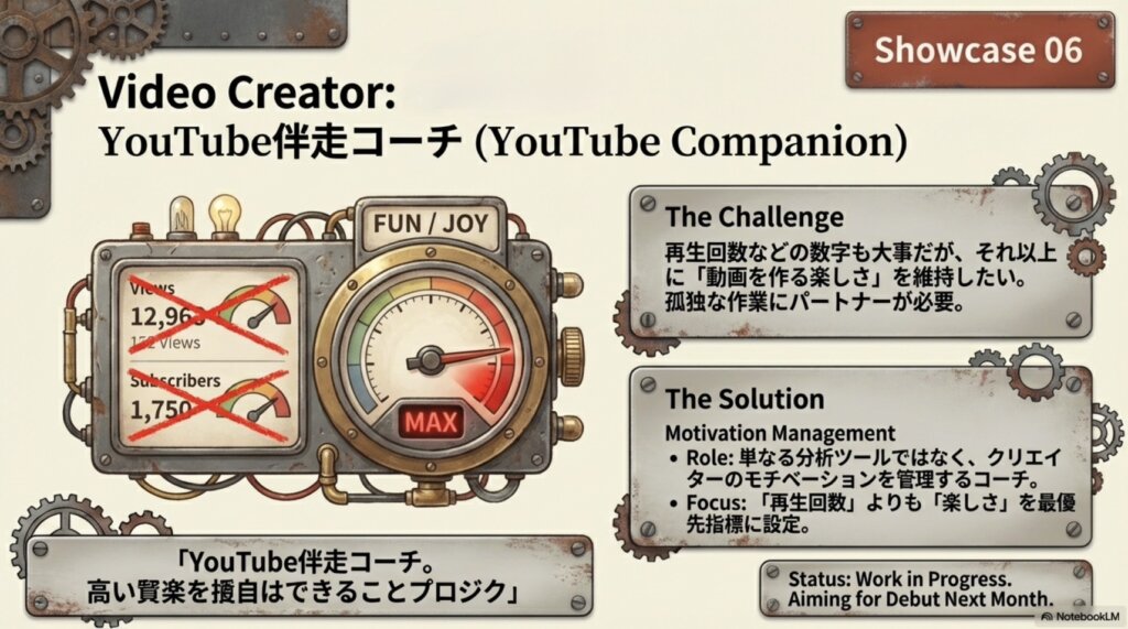 「動画を作りたいけれど、何から始めたらいいかわからない」という初心者のために、参加者のある男性は「YouTubeコーチ」を開発しました。再生回数という数字だけを追うのではなく、「発信することの楽しさ」を維持しながら、技術的なアドバイスをくれるコーチです。NotebookLMを活用して、プロの動画編集ノウハウをAIに学習させる手法は、まさに現代の「デジタル徒弟制度」と言えます。