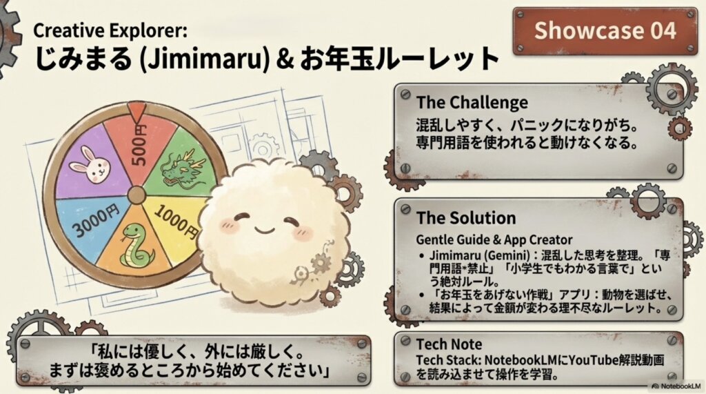 金額がランダムで決まったり、時には「ハズレ」が出たりといった遊び心満載の仕掛けを、AIとの対話だけで形にされたのです。「誰かを喜ばせたい」という純粋な目的があるからこそ、技術の壁を軽々と超えていける。AIは家族の絆を深める「魔法の道具」にもなるのだと、会場全体が優しい空気に包まれた瞬間でした。
