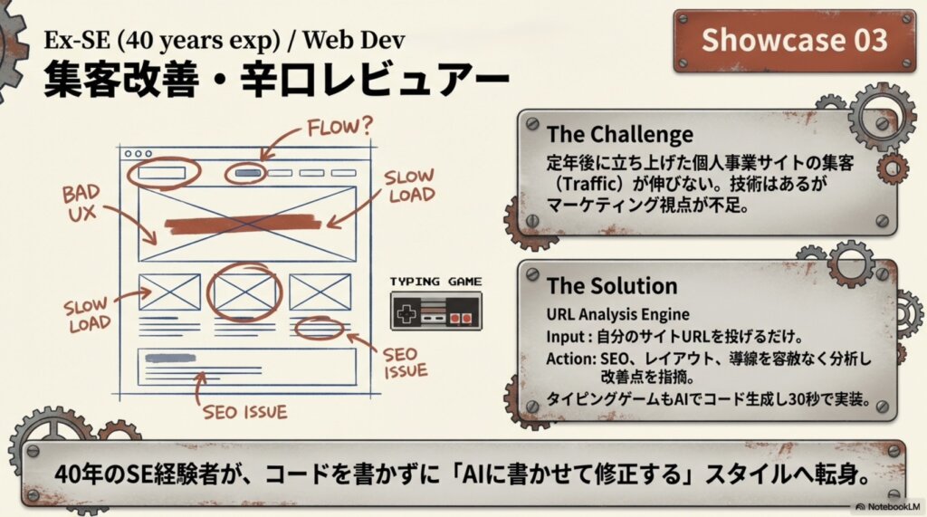 「技術的なことはできても、マーケティングや見せ方はまた別。でもAIがいれば、自分一人では気づけない『弱点』を冷静に教えてくれる」。40年のキャリアを持つベテランが、AIという新しい鏡を通じて、自分のビジネスを再定義していく姿。それは、「経験」と「最新技術」が掛け合わさった時に生まれる、シニア世代の圧倒的な強さを感じさせるものでした。
