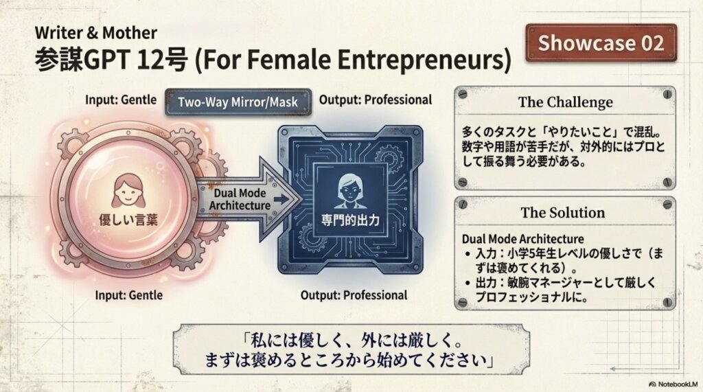 これはまさに、AI課題発見フレームワークによる「個人の特性への完全最適化」です。自分自身の心理的なハードルを下げる「優しさ」と、ビジネスを勝ち抜くための「強さ」。この両極端なニーズを一つのツールで解決できることこそが、カスタムAI(GPTs/Gems)を構築する最大のメリットです。「専門用語が苦手だから」と夢を諦める必要は、もうありません。AIがあなたの「最高の翻訳者」となり、想いを形にする力を授けてくれるのです。