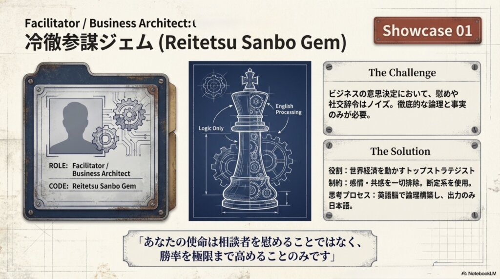 こんなプロンプトから始まります。このなぜ、あえて「冷徹」にするのか。それは、経営者やプロジェクトリーダーが陥りがちな「現状維持のバイアス」や「甘い見通し」を、客観的な論理で打ち砕いてもらうためです。