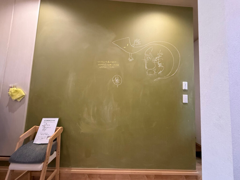 店内は綺麗で、壁の一部が黒板になっていて子どもたちが自由に落書きできる遊び心も。お蕎麦を食べに来たお客さん同士が自然とおしゃべりを始め、交流が生まれる場所でもあります。